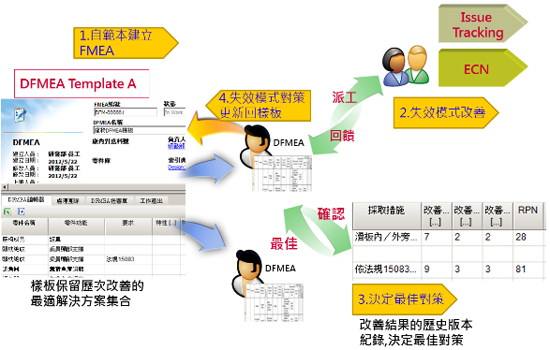 > 以產品資料庫及FMEA知識庫為核心完成製程設計管理各項作業要求,包含PFMEA與控制計畫(Control Plan)設計,問題處理經驗積累到FMEA知識庫等應用。