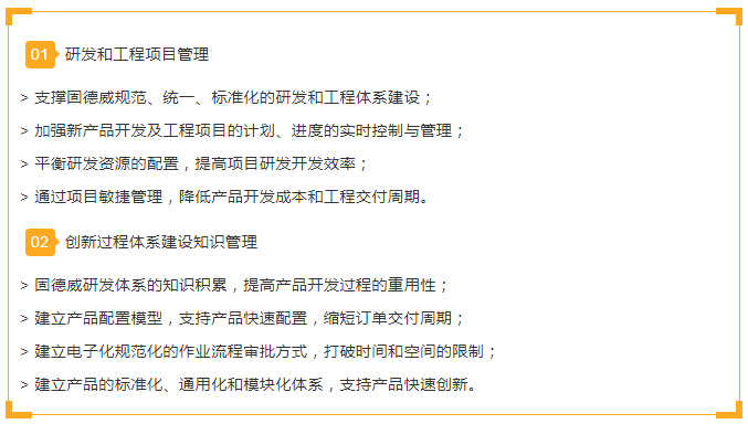 本次项目的实施功能包含产品管理、工程变更管理、项目管理及问题、ERP集成并采用博威长期开发出来的增值套件功能满足以下主要目标: