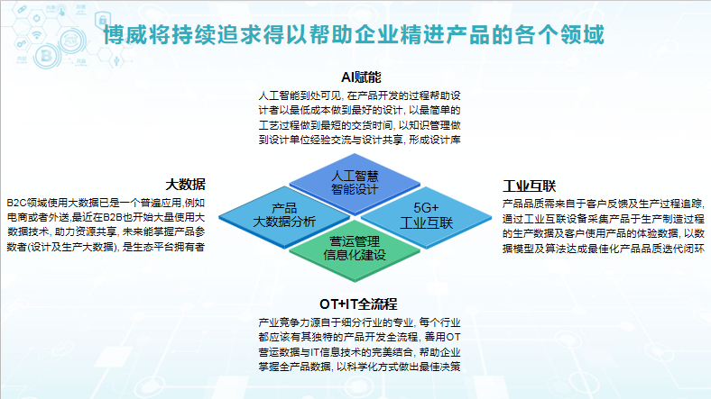 產業競爭力源自於細分行業的專業, 每個行業都應該有其獨特的產品開發全流程, 善用OT營運數據與IT資訊技術的完美結合, 幫助企業掌握全產品數據, 以科學化方式做出最佳決策。