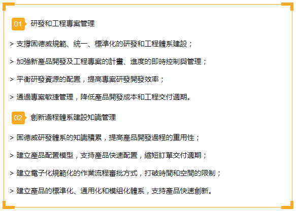 實施期間僅系統架構就重建了三次(編碼規則、ERP對接、EC變更規範策略調整),每次歷時3-4個月,每次都是一次鳳凰涅槃浴火重生的過程,在這種情況下,雙方專案團隊能堅持過來實屬不易。如果說項目團隊投入一般專案要八分力,這個專案的投入就需要十二分力了,但就結果而言,本項目肯定是一個值得樹立為標杆的專案,其中許多經驗值得分享與學習。總體檢視固德威一期專案的成果,效益已慢慢體現, 並朝預期的目標邁進,可喜可賀。