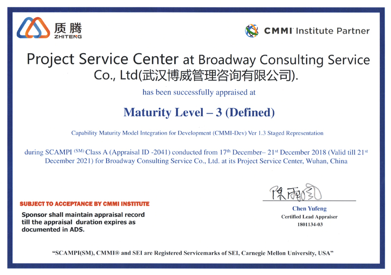 剛跨進2019,博威就迎來了一個可喜可賀的重大消息,武漢博威管理諮詢有限公司動員專案團隊、產品開發團隊、系統實施團隊經過幾個月的努力,不負眾望順利通過了CMMI 3級認證評估並取得了證書。