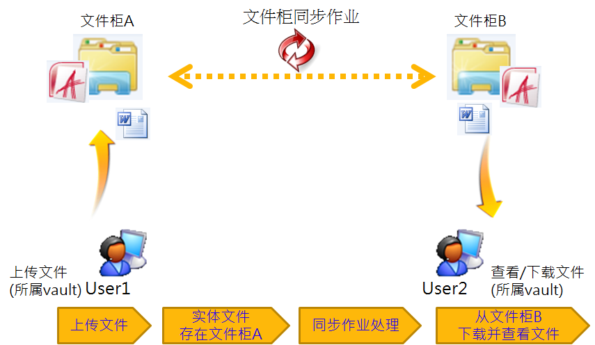 > 可于文档柜中设定不同条件的同步规则(包含同步模式、触发时机、同步方法),系统自动依照同步规则,将文档复制到目标文档柜中。
