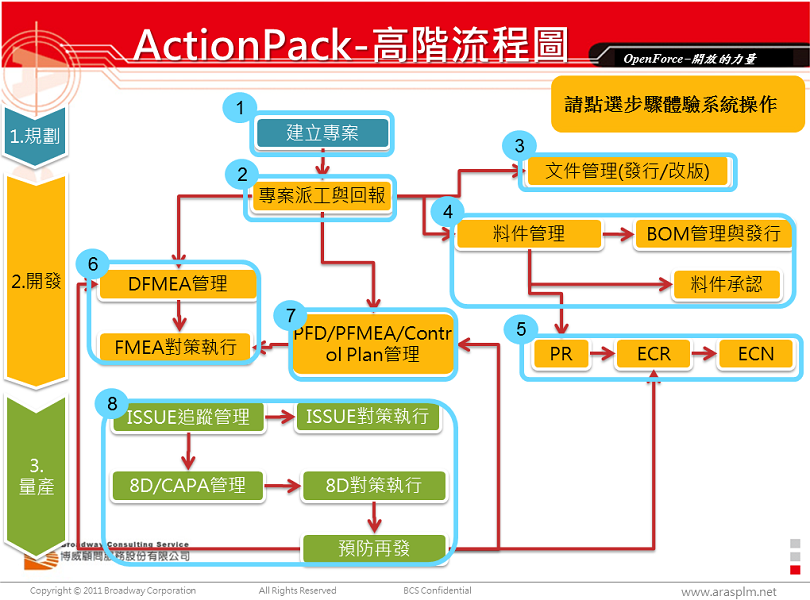 博威Action Pack(行動套件)產品具備幾個重要特性:功能完整、快速建置、隨拆即用、並可彈性擴充應用。這一次發布的套件產品是博威公司在PLM市場經營多年,所累積的各個行業經驗所開發,已經被證實為最適用於中小型企業的解決方案。