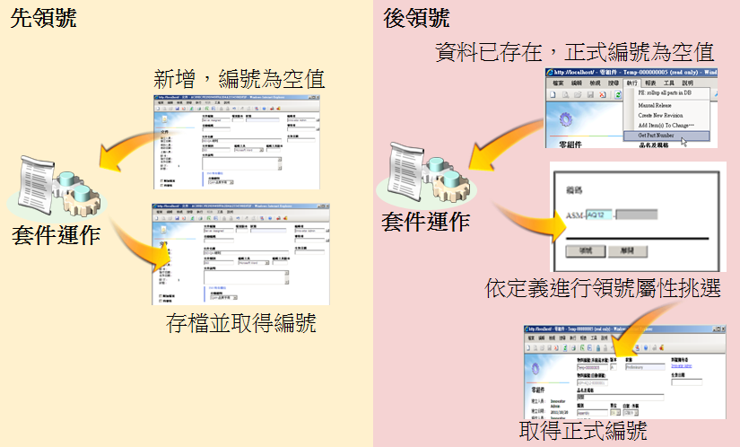 自動領號功能可應用在企業內各類文件的編號、圖檔的圖號、零組件(料號)的編號以及流程表單編號...等。依據企業內部文件規範的定義,本功能可讓使用者針對不同文件類別、零組件屬性、及不同性質的流程表單等彈性地定義自動領號機制。自動領號功能可減低文件管制人員在編定文件編號、圖號、或零組件編號的工作並可免除重覆給號所衍生的困擾。其提供之編號方式除了流水號外,另外可針對常用的年、月、日、固定字元,及透過屬性定義方式以符合企業多元化的編碼需求。同時在領號的時機上可定義為預設領號及手動領號兩種模式,以符合作業過程中可能採用之事先給號,或是審核後給號等兩種不同的作業需求。