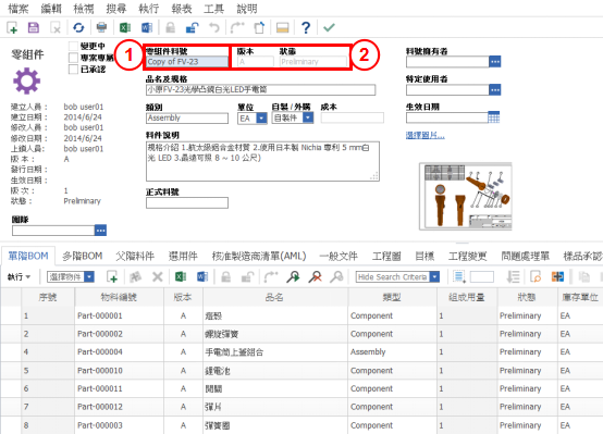 補充說明:使用另存對象功能後,系統會自動新建一項草稿零部件,原有零部件:品名及規格、類別、單位、自製及外購、零件說明字段內容,以及單階BOM、多階BOM、替換件、文檔、承認書、工程圖都會被複製。