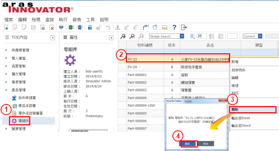 補充說明:零組件狀態必須為Preliminary,且未被鎖定未被關聯,才允許被刪除。