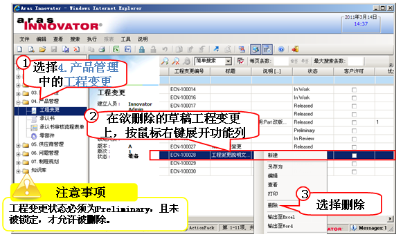 b. 工程變更狀態必須為Preliminary,且未被鎖定,才允許被刪除。