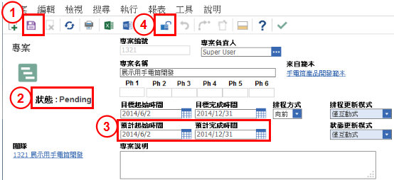 3.系統會依據專案計畫的專案任務預計開始和結束日期,計算出項目的預計啟始和完成時間。
