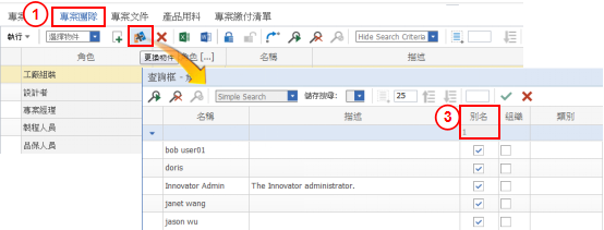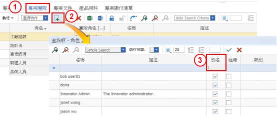 2.新建團隊(1)-若要新建團隊角色,點擊“新建”按鈕,打開角色搜索選擇窗口,默認只能搜索"別名為1"的角色資料,選擇欲指派工作擔當者的人員,點擊ˇ確認選擇。