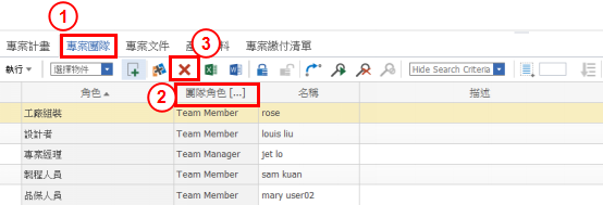 3.欲刪除團隊角色及工作擔當者,則選擇欲刪除的對象,點擊“刪除”,團隊角色及工作擔當者則移除專案團隊清單。