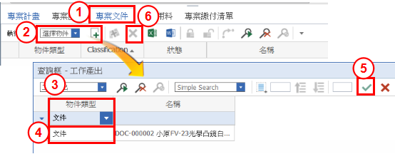 3.選擇要加至專案文檔關連列表數據的對象類型並搜索。