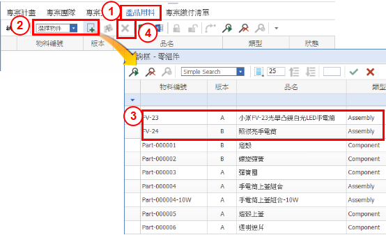 3.可選擇一筆,或按住鍵盤上的shift或ctrl按鍵,同時選擇多筆零組件加入產品用料關連清單。