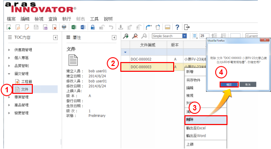 補充說明:文檔狀態必須為Preliminary,且未被鎖定,才允許被刪除。