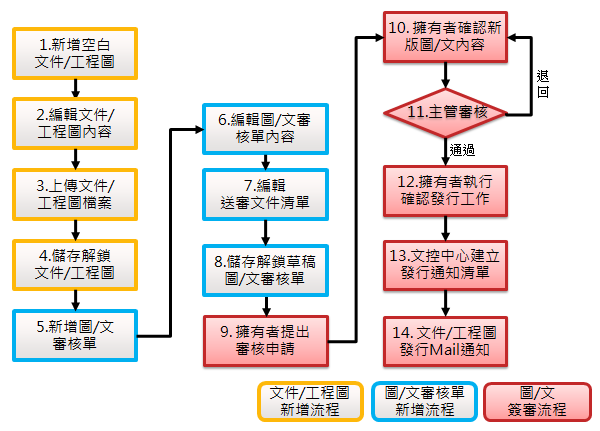 圖文審核流程表單:提供已建立或改版的工程圖及文件作為內容審核及發行之電子簽核流程。系統內建的流程是針對工程圖及工作檔案作為已建立及改版之內容審核流程,相關人員可在圖文審核流程中表達對圖、文內容的意見,在流程中所有的簽審意見皆會被保留在資料庫中,以供日後相關人員查詢。