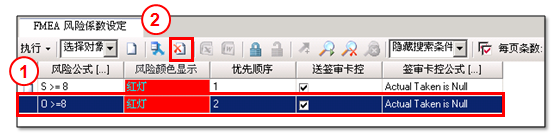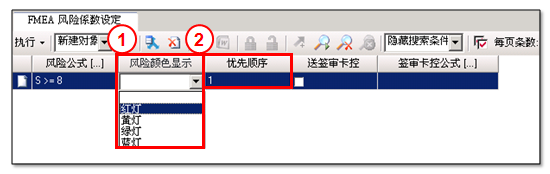 1.若要設定此FMEA風險公式為亮燈條件,則在風險顏色顯示字段,從下拉選單選擇欲亮燈的顏色。